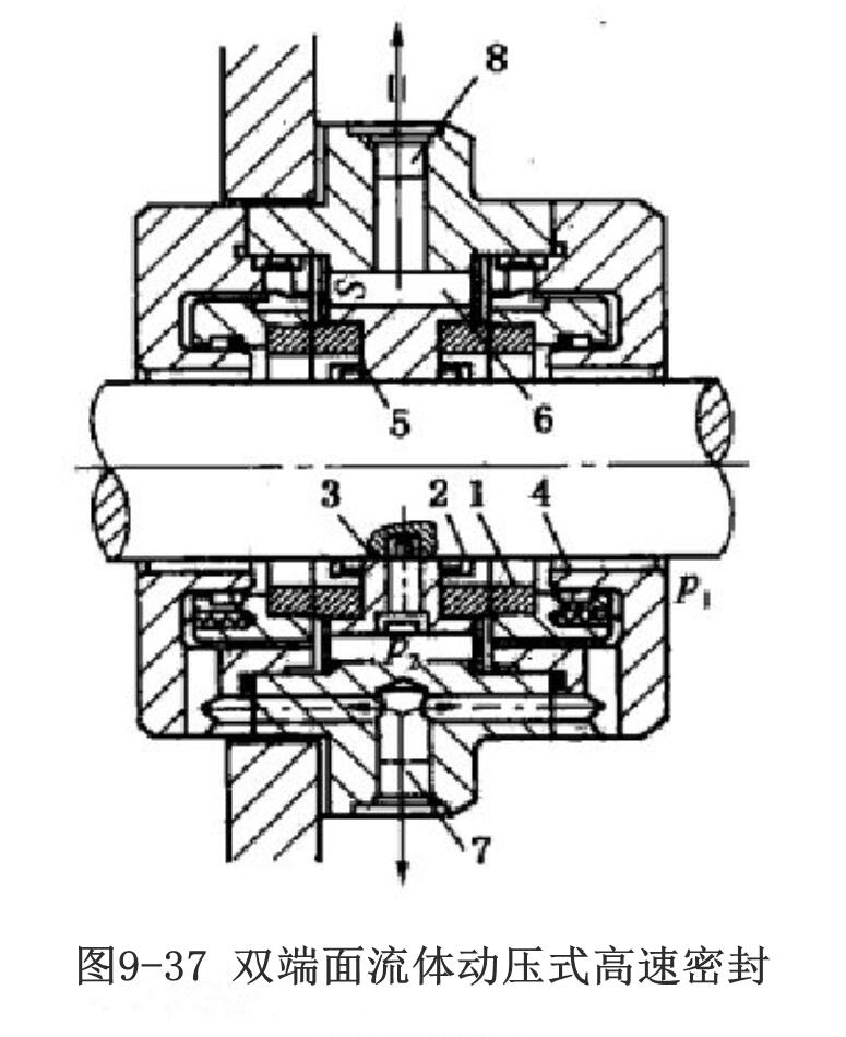 雙端面流體動壓式高速密封如圖9一37所示。該種密封結(jié)構(gòu)中旋轉(zhuǎn)環(huán)(動環(huán))的運(yùn)轉(zhuǎn)很平穩(wěn),而且靜環(huán)(石墨環(huán))在運(yùn)轉(zhuǎn)中能自行調(diào)整。不過,在選擇封液時,希望封液的貓度低、氣體吸附性低以及低的結(jié)焦量并且保證在高溫工作條件下密封液在蒸發(fā)時不留殘?jiān)缇垡叶嫉暮铣山橘|(zhì)。