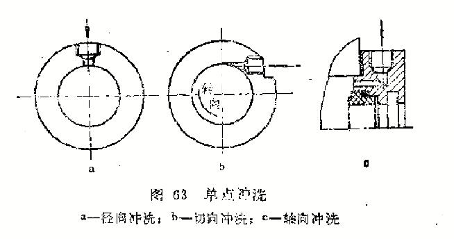單點(diǎn)沖洗:沖洗液由一個(gè)流出口沖洗密封,又可分為徑向、軸向和切向三種方式(圖63)。