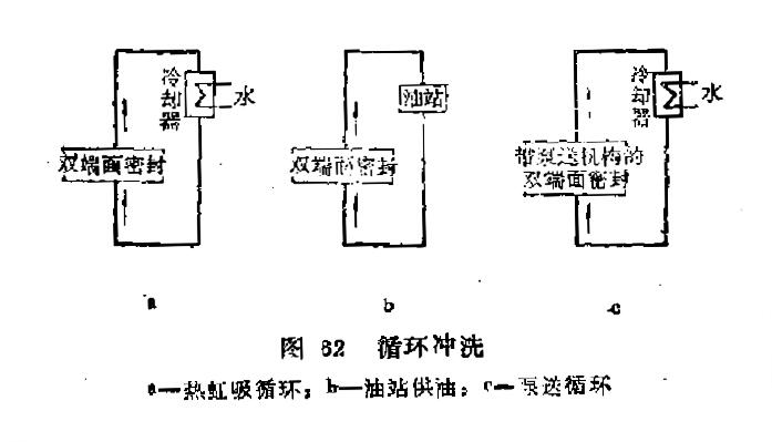 循環(huán)沖洗是通過一個(gè)泵送裝置使外加的密封流體進(jìn)行循環(huán)(圖62)。這里有兩點(diǎn)需引起注意,一是“泵送裝置”,可以是外加的油站和密封腔形成閉合回路進(jìn)行循環(huán),也可在密封腔中裝設(shè)一個(gè)泵,或者是用熱虹吸的原理使流體循環(huán)。另一點(diǎn)要注意的是“外加的密封流體”。這種沖洗方式用在雙端面或多端面密封上,在單端面密封上不采用。