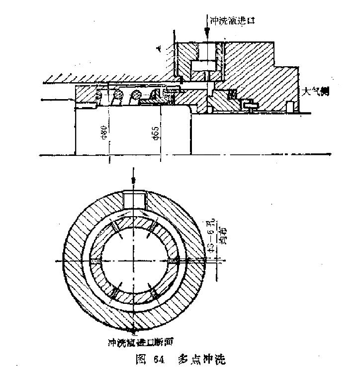 多點(diǎn)沖洗(圖64):沖洗液沿圓周多個(gè)小孔同時(shí)進(jìn)入密封腔,并起沖洗作用。多點(diǎn)沖洗克服了單點(diǎn)沖洗的缺點(diǎn),使摩擦副周圍的溫度分布更均勻。但結(jié)構(gòu)較為復(fù)雜,需增加一個(gè)沖洗環(huán),內(nèi)設(shè)6~8個(gè)小孔,孔徑3~4mm。多點(diǎn)沖洗用在易汽化的介質(zhì)中,也可用在產(chǎn)生摩擦熱較多的高pv值場合。