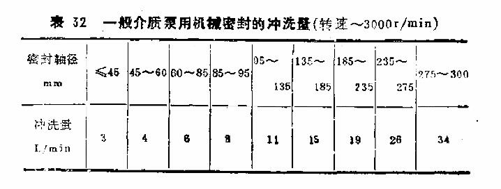 理論上講沖洗量是按密封裝置的熱平衡原理計(jì)算確定。產(chǎn)生的熱量中有摩擦副的摩擦熱、密封旋轉(zhuǎn)產(chǎn)生的攪拌熱、泵內(nèi)流體傳到密封處的熱量等。散失熱量的方式有壓蓋急冷、密封腔夾套冷卻和自然冷卻。產(chǎn)生的熱量減去散失的熱量,兩者的差值應(yīng)是沖洗帶走的熱量。該計(jì)算麻煩,有很多數(shù)據(jù)是選取的,計(jì)算f結(jié)果沒有多大的意義。根據(jù)長期的實(shí)踐和經(jīng)驗(yàn),沖洗量在3~30L/ min,可根據(jù)密封規(guī)格(直徑)和介質(zhì)的種類選取(見表32)。