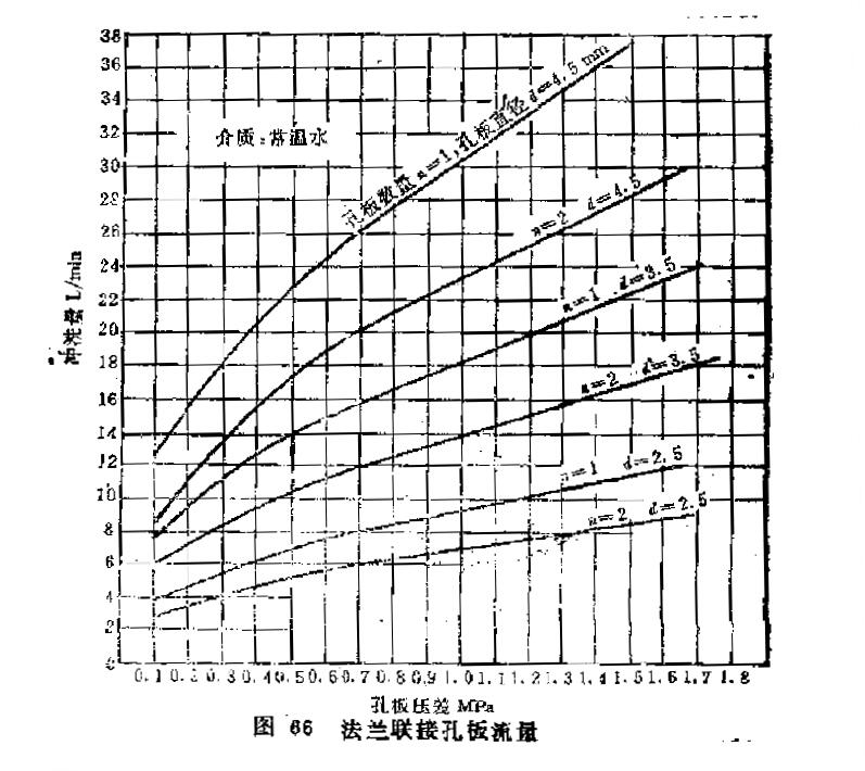 目前用的孔板有兩種結(jié)構(gòu)。一種是法蘭聯(lián)接的,另一種是螺紋聯(lián)接的。法蘭聯(lián)接的孔板結(jié)構(gòu)簡單(圖65),拆裝方便。厚度為4~6mm的圓板帶有一“尾巴”,以便于安裝,上面打鋼印,表示孔徑的數(shù)值。通常用不銹鋼板制造。這種結(jié)構(gòu)的孔板,流量、孔徑和壓差的關(guān)系見(圖66)。